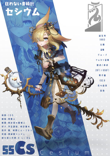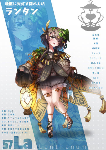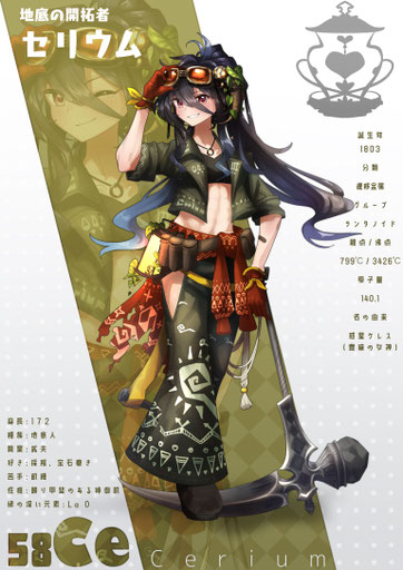 地表の安定しないランタノイド列島の地下を開拓し都市を築いた偉大なる開拓者。希土類元素たちの生活に豊穣をもたらした救世主でもありながら偉ぶることなく仲間やランタンを支える人格者で、仲間からはセリアと言う旧名で親しまれている。