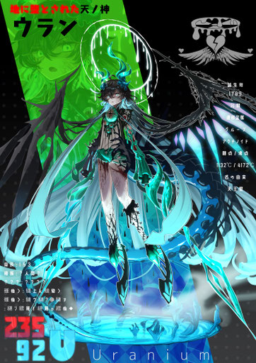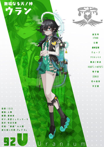 大陸を追放された放射性元素の1人。発熱体質があり、体に冷却水を循環させているだけの「普通」の人間であったが、ある時ウランの身体に特別な才能があると認められ被検体 兼 研究者としての活動を開始した。