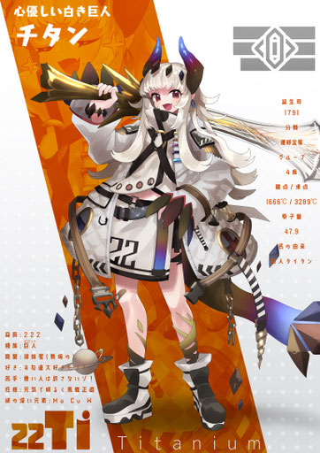 チタンのそうじ屋!という馬鹿でかい看板を掲げた清掃業者(?)の店主を務める巨人族の白い金属。本人は掃除と言っているが戦闘のことを「掃除」と勘違いしており顧客の敵を一掃するのが主な仕事だ。