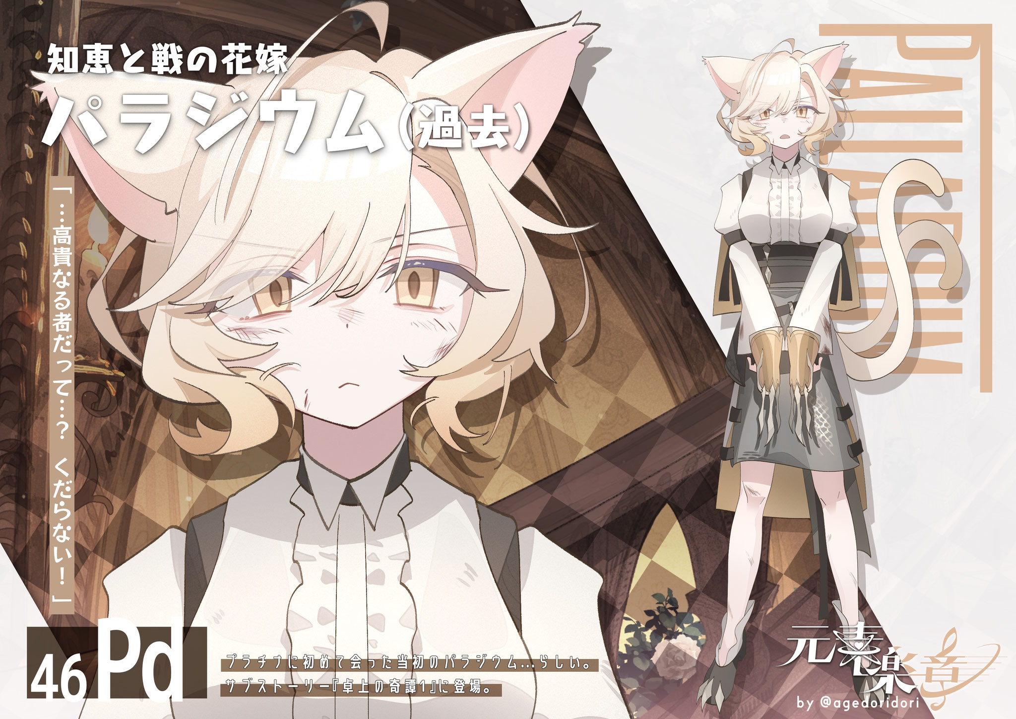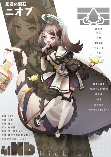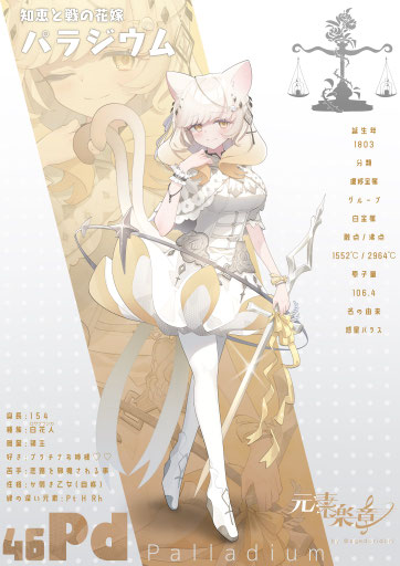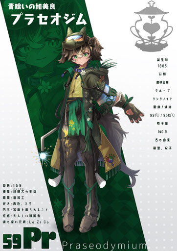 溶接工として地底の金属素材を加工する仕事人。ネオジムは目立ちたがり屋の一方でプラセオジムは大人しい性格のため「双子に見えない!」とよく言われるがそもそも双子ではない。